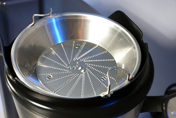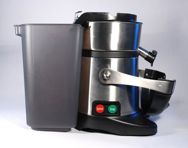 Рабочая чаша, промышленной соковыжималки идет с двумя выводными кранами – для сока и для жмыха. Соответственно, под каждый кран предусмотрен свой стакан. Чаша и емкость для сока изготовлены из нержавеющей стали. Стакан под жмых выполнен из полипропилена, который не окисляется и разрешен для контакта с пищевыми продуктами.