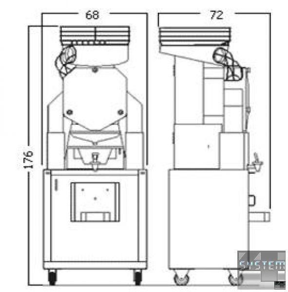 Профессиональная соковыжималка с тумбой и комплектом для наполнения бутылочек. Кожура автоматически сбрасывается в большой пластиковый бак, расположенный внутри тумбы. Тумба-бункер изготовлена из нержавеющей стали и снабжена колесами с фиксаторами. Комплект для наполнения бутылок состоит из соконакопителя большого объема (резервуар с краном, ёмкостью 6 литров) и подставки для бутылок, регулируемой по высоте. Может использоваться не только для цитрусовых, но и для гранатов. Электронный счётчик считает количество отдавленных плодов; может быть запрограммирован для отжима определенного количества апельсин от 1 до 10, после чего соковыжималка остановится автоматически.