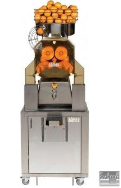 Профессиональная соковыжималка с автоматической системой дозирования сока и загрузочным бункером на 15 кг апельсинов. Скорость отжима 38 апельсинов в минуту. Кожура автоматически сбрасывается в большой пластиковый бак, расположенный внутри тумбы.