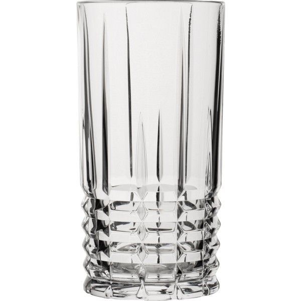 Высокий стакан выполнен из хрустального стекла, которое имеет высокий коэффициент преломления и относится к категории профессиональной посуды, может использоваться очень интенсивно каждый день, его можно мыть в посудомойке.