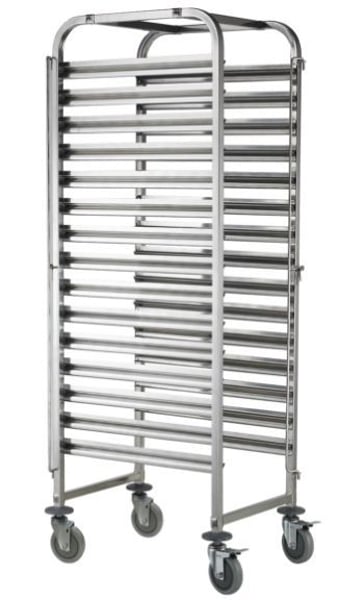 Шпилька для противней оборудована 4-мя поворотными колесами, два из них с тормозным устройством - способствует его удобной мобильности.