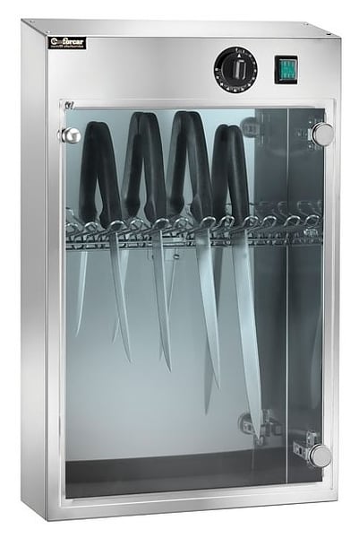 Стерилизатор для ножей Fimar SUV10 ультрафиолетовый имеет корпус из нержавеющей полированной стали AISI304 и дверцу из прозрачного плексигласа.