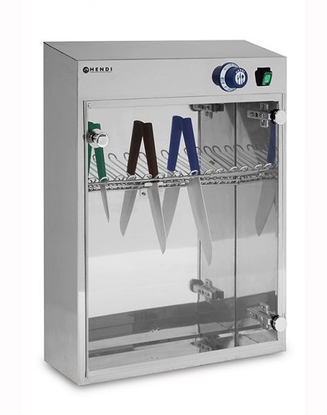 Корпус стерилизатора Hendi полностью выполнен из высококачественной нержавеющей стали, дверца из прозрачного плексигласа с микровыключателем. Внутренний стеллаж также изготовлен из нержавеющей стали и предусмотрен для 14 ножей.