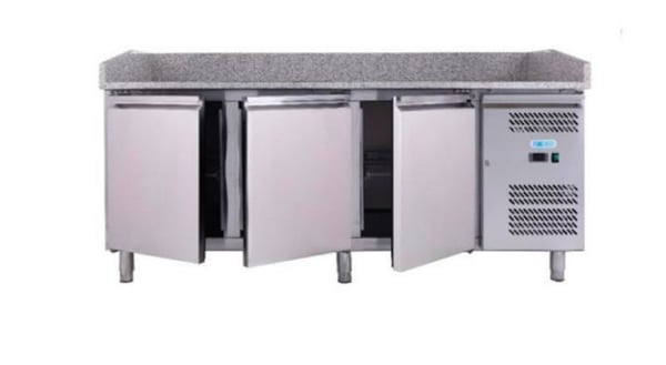 Внутри стола хранятся тестовые заготовки и проходят процесс ферментации, на гранитной столешнице готовят краст и укладывают начинку, а в охлаждаемой витрине хранится сама начинка. Это очень удобное и необходимое профессиональное оборудование на кухне любого ресторана, кафе, бара и больших предприятиях.