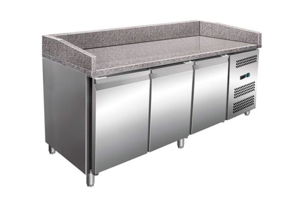 Внутри стола хранятся тестовые заготовки и проходят процесс ферментации, на гранитной столешнице готовят краст и укладывают начинку, а в охлаждаемой витрине хранится сама начинка. Это очень удобное и необходимое профессиональное оборудование на кухне любого ресторана, кафе, бара и больших предприятиях.