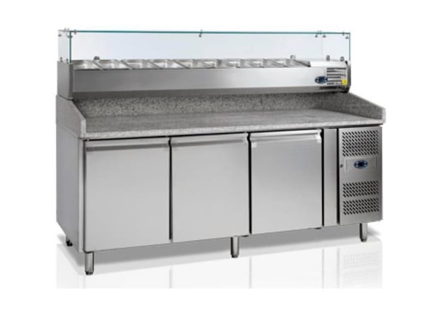 Внутри стола хранятся тестовые заготовки и проходят процесс ферментации, на гранитной столешнице готовят краст и укладывают начинку, а в охлаждаемой витрине хранится сама начинка. Это очень удобное и необходимое профессиональное оборудование на кухне любого ресторана, кафе, бара и больших предприятиях.
