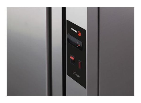 Холодильный агрегат находится справа, охлаждение происходит за счет вентиляции объема рабочей камеры, имеется функция автоматической оттайки. Электронный контроль температуры и оттаивания с цифровым экраном.