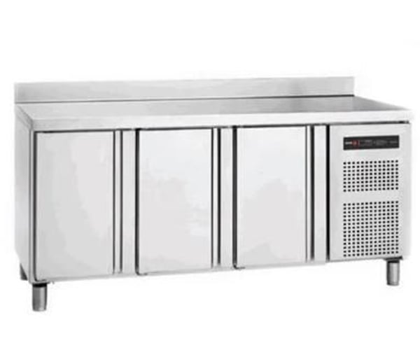 Стол холодильный трехдверный с задним бортом 10 см, внутренняя отделка, регулируемые ножки и внешняя часть столешницы с закругленными углами внизу, выполнена из нержавеющей стали, кроме задней панели.
