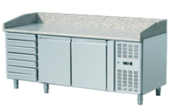 Столы для пиццы изготовлены из нержавеющей стали, столешница выполнена из гранита. Каменная поверхность является более прохладной, менее скользкой и легко моющеюся. Гранитная столешница облегчает работу с тестом. Внутренний объем состовляет 310л, система автоматического оттаивания, защита испарителя от коррозии и подогрев контура двери. Принудительное охлаждение, электронный цифровой термостат. Самозакрывающаяся дверь с возвратным механизмом и ящики удобные в работе. Корпус стола со скругленными углами. Максимальная окружающая температура +33°C.