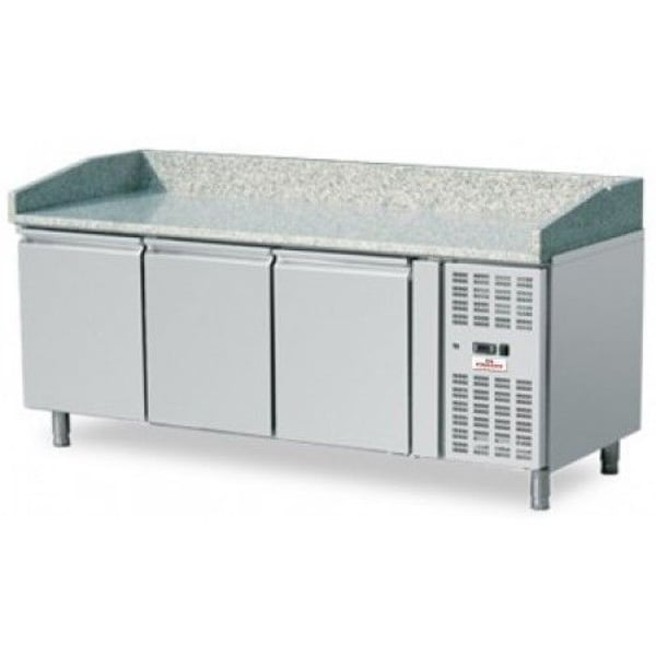 Столы для пиццы изготовлены из нержавеющей стали, столешница выполнена из гранита. Каменная поверхность является более прохладной, менее скользкой и легко моющеюся. Гранитная столешница облегчает работу с тестом. Среднеразмерная трехдверная модель. Внутренний объем состовляет 460л, система автоматического оттаивания, защита испарителя от коррозии и подогрев контура двери. Принудительное охлаждение, электронный цифровой термостат. Корпус стола со скругленными углами. Максимальная окружающая температура +33°C.