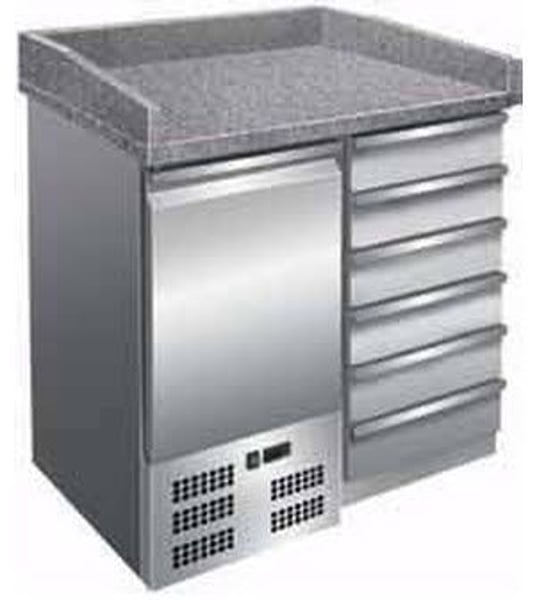 Модель оснащена столешницей которая имеет 1 дверцу и 6 охлаждающих ящиков. Внешний и внутренний корпус из нержавеющей стали с закругленными внутренними углами для легкой очистки. Инвентарь оборудован холодильной установкой, которая поддерживает определенный температурный режим в охлаждаемом отделении стола, а так же присутствует циркуляция холодного воздуха с автоматическим размораживанием.