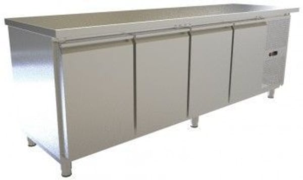 Стол холодильный с четырьмя распашными дверьми с возвратным механизмом, также подогрев по контуру двери препятствует образования конденсата. Нижнее расположение компрессора. Встроенный агрегат, извлекаемый для обслуживания, а также открытие передней панели ключом.