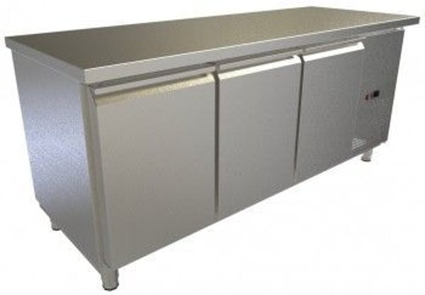 Стол холодильный с тремя распашными дверьми с возвратным механизмом, также подогрев по контуру двери препятствует образования конденсата. Нижнее расположение компрессора. Встроенный агрегат, извлекаемый для обслуживания, а также открытие передней панели ключом.