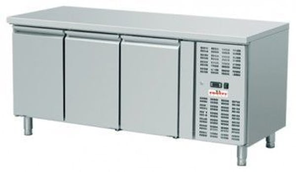 Стол с тремя распашными дверьми с возвратным механизмом, также подогрев по контуру двери препятствует образования конденсата. Нижнее расположение компрессора. Встроенный агрегат, извлекаемый для обслуживания, а также открытие передней панели ключом.