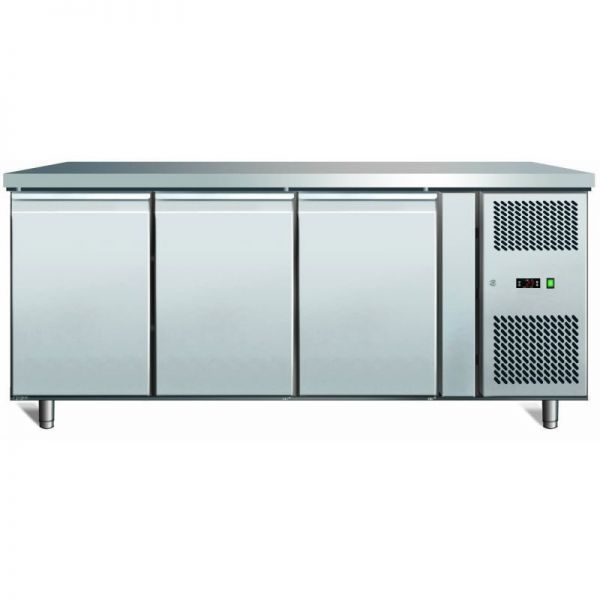 Морозильный стол сочетает в себе охлаждаемую поверхность, которую используют как столешницу для приготовления блюд, и морозильный шкаф, предназначенный для хранения продуктов. В холодильном отделении постоянно поддерживается температура от -22 до -18 °С. Корпус и столешница изготовлены из качественной нержавеющей стали. Ножки стола регулируются по высоте. Трехдверная морозилка работает при температуре окружающей среды до +43°C.