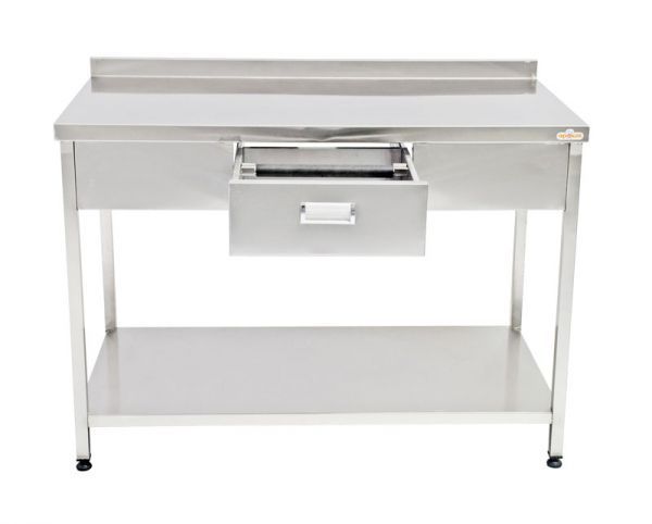Пристенный борт высотой 50 мм. Под столешницей выдвижной ящик для сбора жмыха, который крепится на телескопических направляющих. Нижняя полка. Регулируемые по высоте винт-опоры.