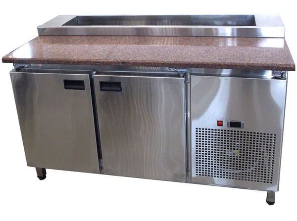 Внутри стола хранятся тестовые заготовки и проходят процесс ферментации, на гранитной столешнице готовят краст и укладывают начинку, а в охлаждаемой витрине хранится сама начинка. Это очень удобное и необходимое профессиональное оборудование на кухне любого ресторана, кафе, бара и больших предприятиях.