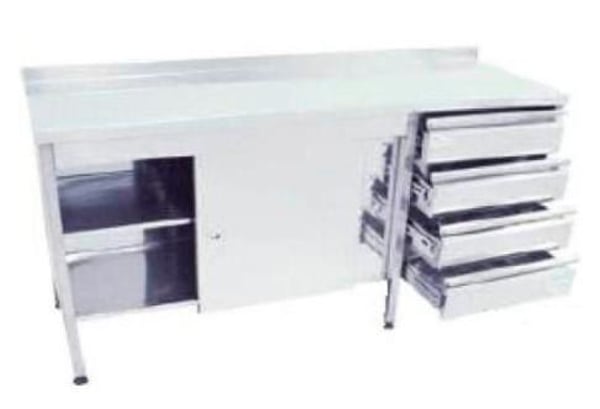 Столы-тумбы предназначены для хранения посуды, инвентаря и упакованных пищевых продуктов. Столешница служит рабочей поверхностью. Благодаря наличию закрытого объема, выставляемые предметы защищены от жирового налета, пара и пыли. Столы-тумбы полностью изготовлены из нержавеющей стали, что обеспечивают аккуратный внешний вид и позволяет применять их в горячих цехах, моечных отделениях с большой влажностью. Столы-тумбы снабжены регулируемыми по высоте винт-опорами. Пристенный борт высотой 50 мм. Выдвижные ящики для удобства сан.обработки могут сниматься.