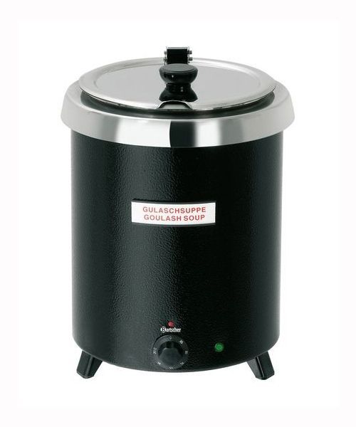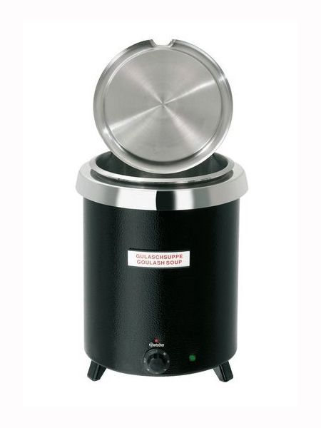 Электрическая супница с откидной крышкой из нержавейки удобна в использовании. Есть вырез для ковша и теплоизолированная ручка.