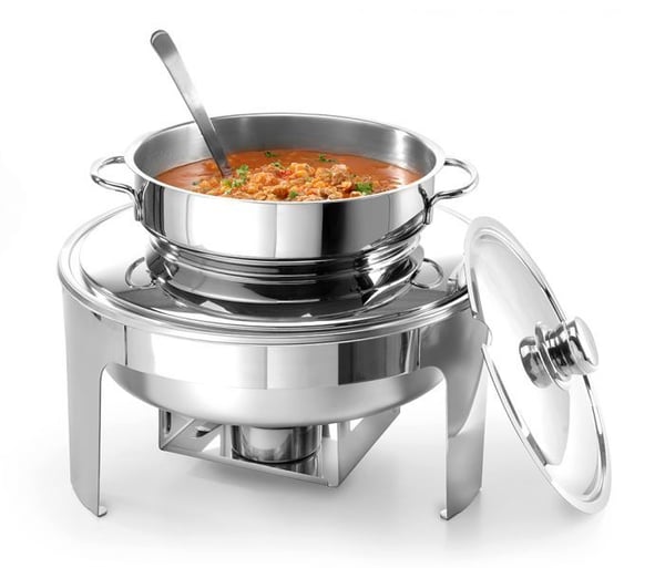 Емкость для супа с двумя ручками помещается в водяной бане, которая сохраняет температуру первого блюда. Предусмотрена специальная крышка с отверстием для половника.