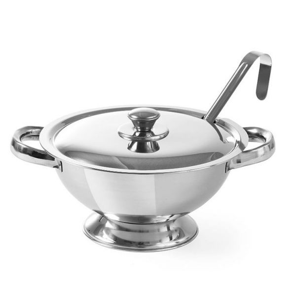 Супница с крышкой выполнена из высококачественной нержавеющей стали. По бокам расположены ручки.