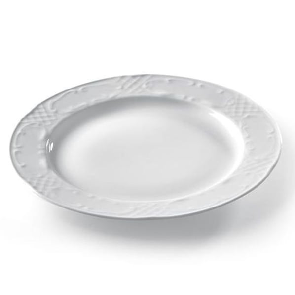 Тарелка мелкая, изготовлена из ударопрочного белого фарфора. Усиленные края, глазурь высокого качества.