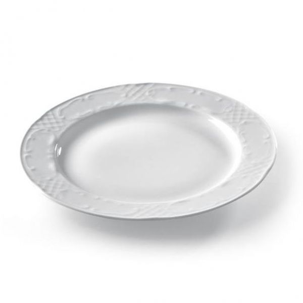 Тарелка мелкая, изготовлена из ударопрочного белого фарфора. Усиленные края, глазурь высокого качества.