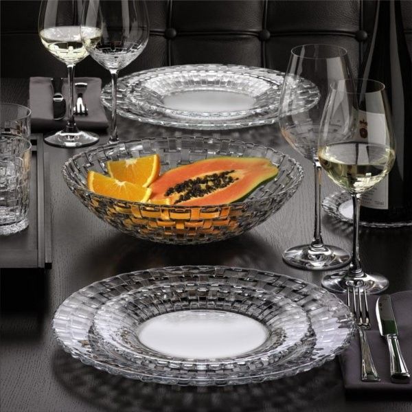 Хрустальная тарелка серии Bossa Nova с текстурным узором переплета ткани, идеально подойдет для подачи салатов и фруктов в ресторанах, гостиницах и в заведениях общественного питания различного направления, а также для презентации различных закусок.