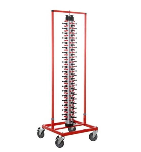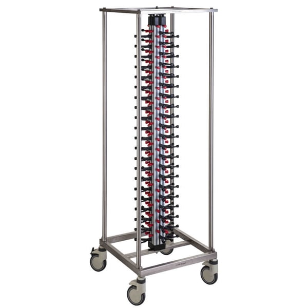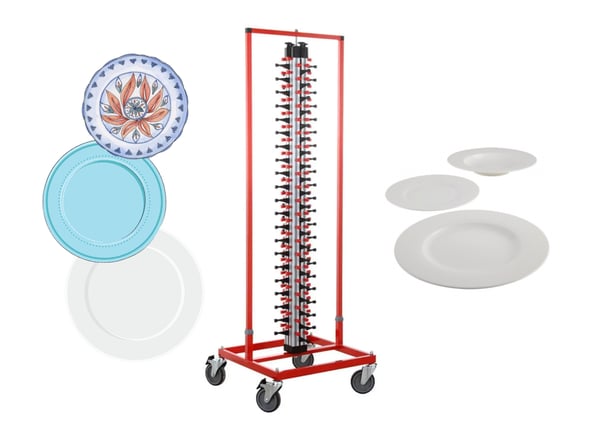 Держатели для тарелок размещены так, что позволяют размещать посуду разного размера. Вмещает до 84 тарелок. 4 маневровых поворотных колеса, 2 из которых с тормозной системой.