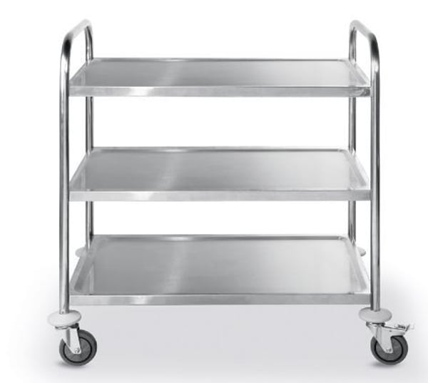 Тележка сделана из нержавеющей стали, которая характеризуется высокой коррозийной устойчивостью и способностью выдержать большие нагрузки.