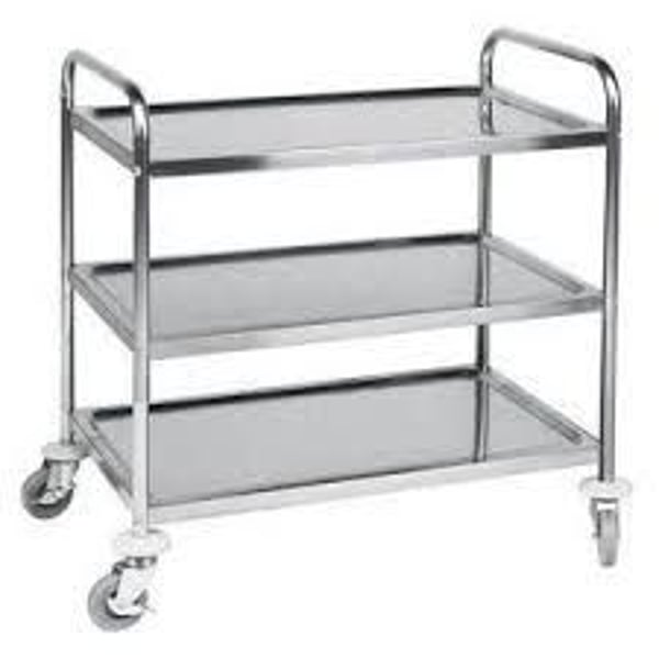 Тележка выполнена из высококачественной нержавеющей стали, которая характеризуется высокой коррозийной устойчивостью и способностью выдержать большие нагрузки.