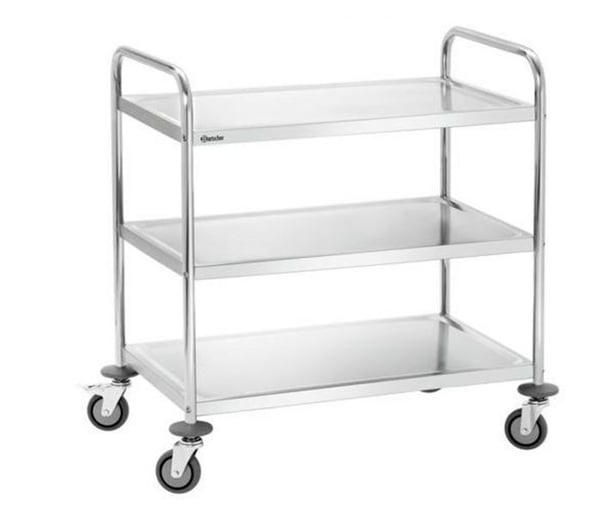 Тележка выполнена из высококачественной нержавеющей стали, которая характеризуется высокой коррозийной устойчивостью и способностью выдержать большие нагрузки.