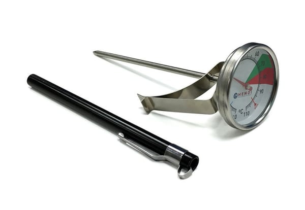 Термометр для молока Hendi - важный атрибут начинающего баристы, применяется для получения нежной и воздушной пены при создании капучино, латте и других кофейных напитков на кофемашинах. Зеленое поле указывает идеальную температуру вспененного молока для капучино, латте и других горячих напитков из кофе.