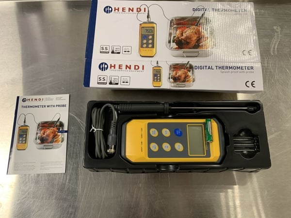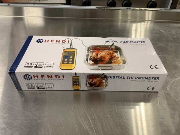 Термометр, служит для замера температуры продуктов, готовый блюд, посуды и тд. Выполнен в пластиковом корпусе, оборудован щупом, отображает температуры в Цельсиях и Фарингейтах. Имеет ЖК дисплей с подсветкой.