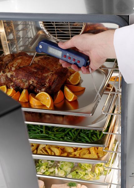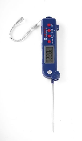 Термометр с выдвижным зондом, служит для замера температуры продуктов, готовый блюд, посуды и тд. Выполнен в пластиковом корпусе, отображает температуры в Цельсиях и Фарингейтах. Имеет ЖК дисплей с подсветкой.