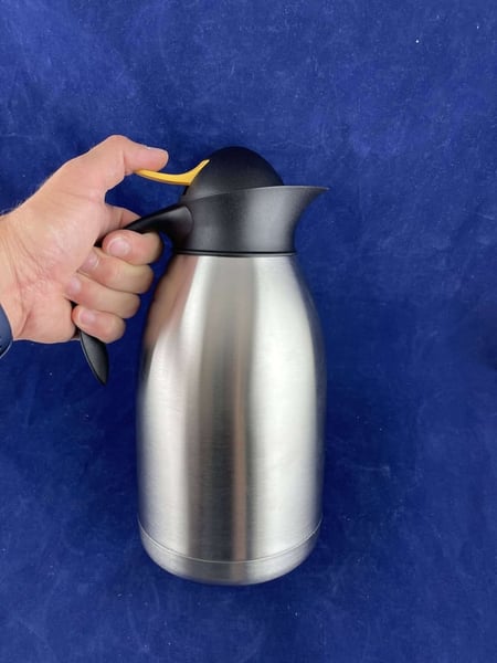 Термос выполнен из нержавеющей стали, с двойными стенками. Крышка с желтой кнопкой и ручка из полипропилена.