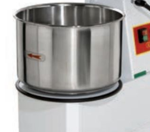 Спиральный миксер благодаря своей конструкции, оптимальной скорости вращения месильного органа и дежи обеспечивает интенсивный замес. Тесто обладает высокой пластичностью и улучшает качество выпекания продукции. Модель оснащена отсекателем, электромеханической панелью управления, таймером и колесами.