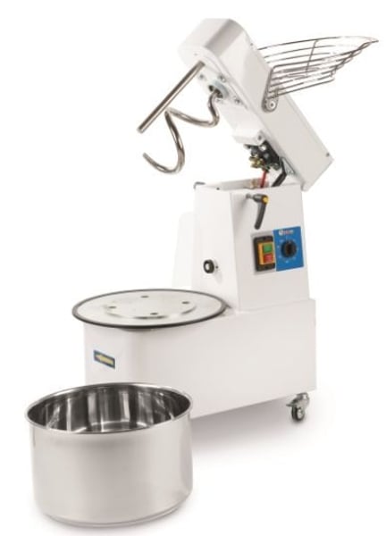 Тестомес спиральный оборудован съемной дежой с откидным верхом, спиральным месительным органом и крышкой, которые выполнены из пищевой нержавеющей стали 18/10.