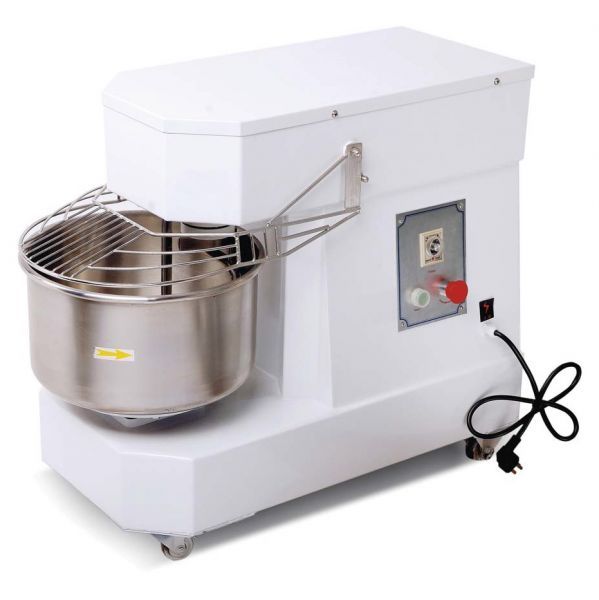 Спиральный тестомес с фиксированной дежей, корпус изготовлен из высококачественной нержавеющей стали, покрыт лакированным покрытием белого цвета.