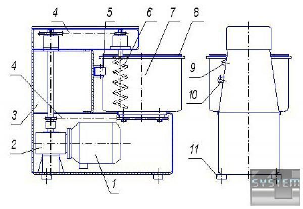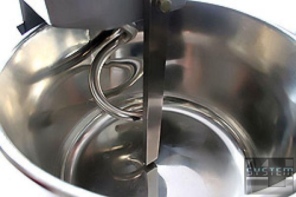 Электропривод машины вращает дежу, наполненную смесью для приготовления теста. Одновременно с вращением дежи вращается спираль, которая перемешивает тесто. Совместным вращением дежи вокруг своей оси и спирали внутри дежи обеспечивается тщательное вымешивание теста. Особая форма спирали позволяет вымешивать даже небольшое количество теста.