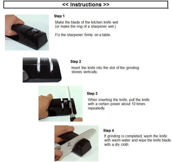 Механическая точилка подходит для ножей с двусторонним типом заточки (угол заточки режущей кромки ножей 15-20гр.), а также для серрейторных ножей и ножей с волнообразной заточкой режущей кромки.