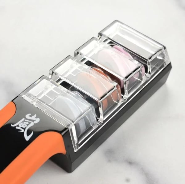 Трехступенчатое точило Yaxell 37222 предназначено для заточки ножей из стали VG10 и SG2. Для заточки ножа потребуется всего несколько минут. Устройство используется шеф-поварами всего мира и обеспечивает острую кромку лезвия ножа с заточкой под углом 12°.