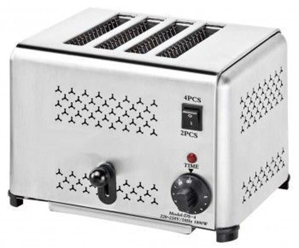 Корпус вертикального тостера и выдвижной поддон для сбора крошек.выполнен из пищевой нержавеющей стали, расчитан на разогрев и приготовление 4 кусков. Таймер на 5 мин. со звуковым сигналом, индикатор работы тостера. Отдельная кнопка вкл./выкл. машины. Размеры 315x270x220мм. Напряжение 220В, мощность 1,80кВт.