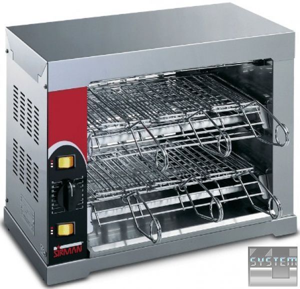 Тостеры Sirman 12Q 3,6 идеальны для подогрева пиццы, бутербродов и полуфабрикатов, а также для приготовления гамбургеров, сосисок, тостов с начинкой и пресных лепешек «пьядина», картошки, булочек и различных закусок. Тостеры изготовлены полностью из нержавеющей стали, снабжены съемными решётками и лотком для сбора остатков, что упрощает очистку. Хромированные нержавеющие щипцы и таймер на 1-15 минут входят в комплект поставки.