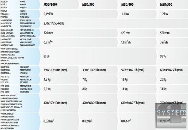 - вакуумный насос с сухим уплотнением (за исключением модели MSD500, где насос работает в масляной ванне).