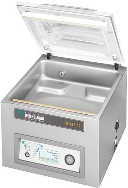 Усовершенствованная модель упаковщика вакуумного Henkelman серии Jumbo широко применяются в супермаркетах, общепитах. Предназначен для пищевых продуктов. Идеально подходит для упаковки сыров, мяса, фруктов, овощей. Упаковачная машина способствует безопасному увеличению срока годности и качества продукта, соответственно увеличивает товарооборот и ассортимент. Корпус и вакуумная камера изготовлены из качественной нержавеющей стали и оснащена прозрачной крышкой, для наглядного контроля за процесом упаковки. Также возможно уменьшить размер камеры специальными габаритными вставками. Сенсорная система управления упаковочнога апарата позволяет контролировать весь процесс упаковки, а также приостановить или прерывать цикл работы. Сварная планка упаковщика составляет длину 280 мм, а запаечная струна 3,5 мм. в ширину. Также упаковщик позволяет запаивать испачканные пакеты жировым составом.