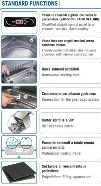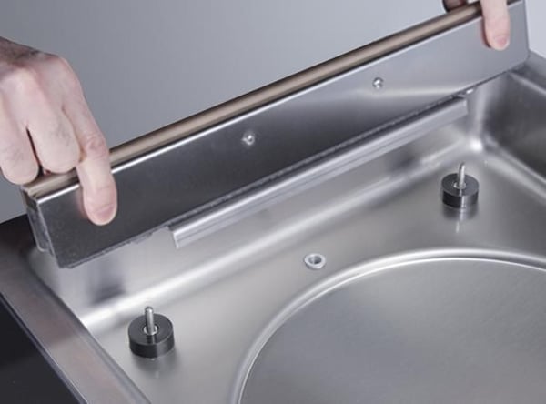 Корпус и камера упаковщика выполнен из нержавеющей стали и оснащен выпуклой крышкой из плексигласа. Камера с закругленными углами и углублением для сбора жидкости, что предотвращает скопление там загрязнений.