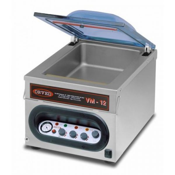 Машина для вакуумной упаковки настольная с электромеханическим управлением оснащена камерой, выпуклой крышкой. Внутренние размеры камеры - 270х400х160мм. Длина шва - 250мм. Номинальная скорость насоса - 8м.куб./ч. Конечное давление - 2мбар. Аппарат оснащен вакуумным датчиком, таймером, системой автоматического охлаждения, электроклапаном для подачи воздуха, несколькими уровнями запайки. Запайка осуществляется автоматически как внутри камеры, так и вне ее. Для упаковки используются гладкие пакеты.