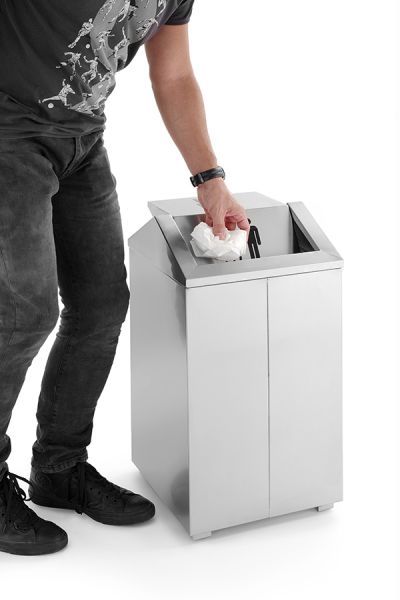 Контейнер для мусора выполнен в цвете металлик, что делает его более практичным в эксплуатации.