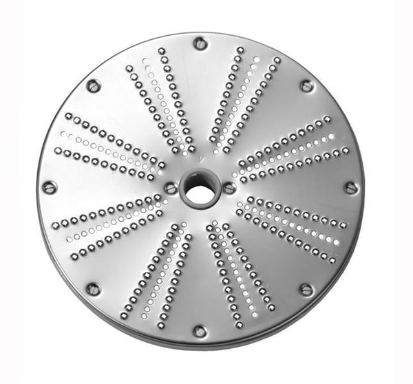 На рабочей поверхности диска V-образно нанесено перфорацию - это мелкие отверстия, сквозь которые выполняется протирка овощей и фруктов для пюре. Натирание осуществляется благодаря давлению поршня на продукт и соответственно его трения об режущий элемент диска. Применяется для овощерезок Top Line 300, 600, 800.